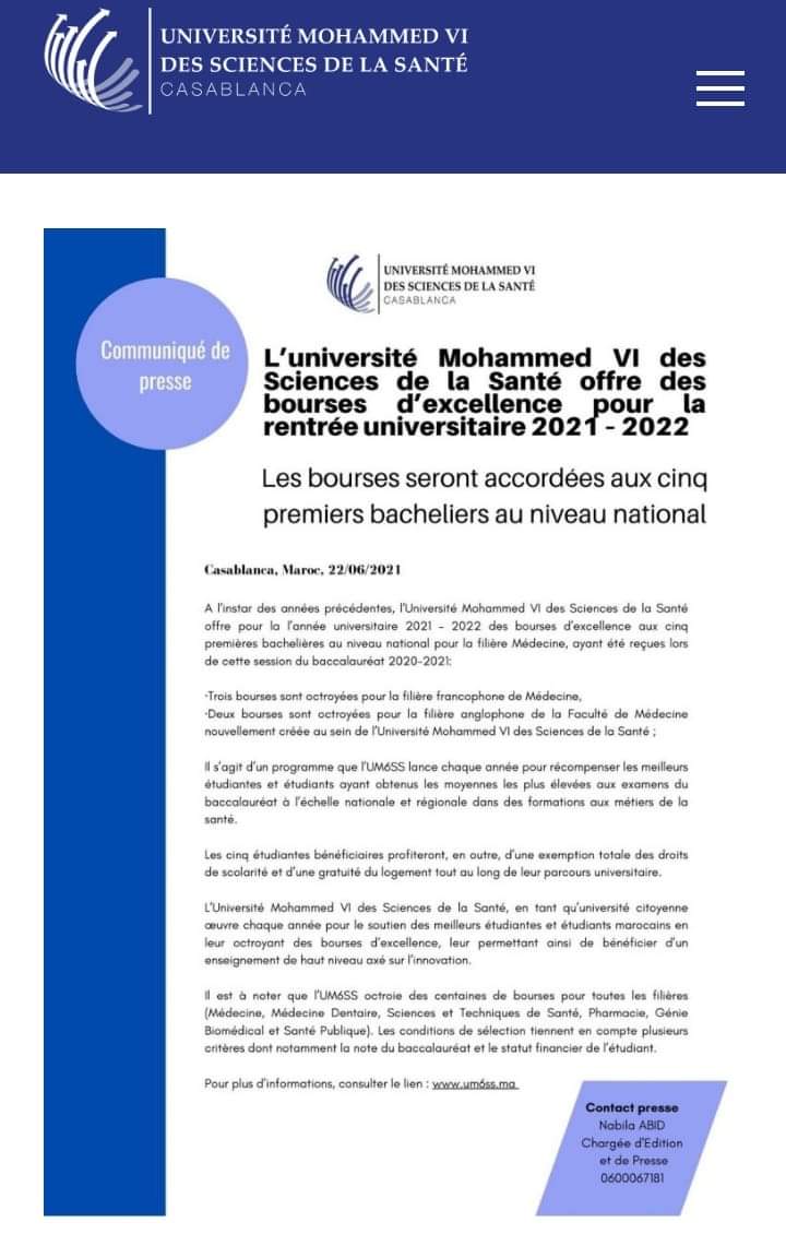 جامعة محمد السادس لعلوم الصحة تمنح منحة التميز لفائدة التلاميذ الخمس الاوائل بالمغرب في امتحانات البكالوريا لسنة 2021.
