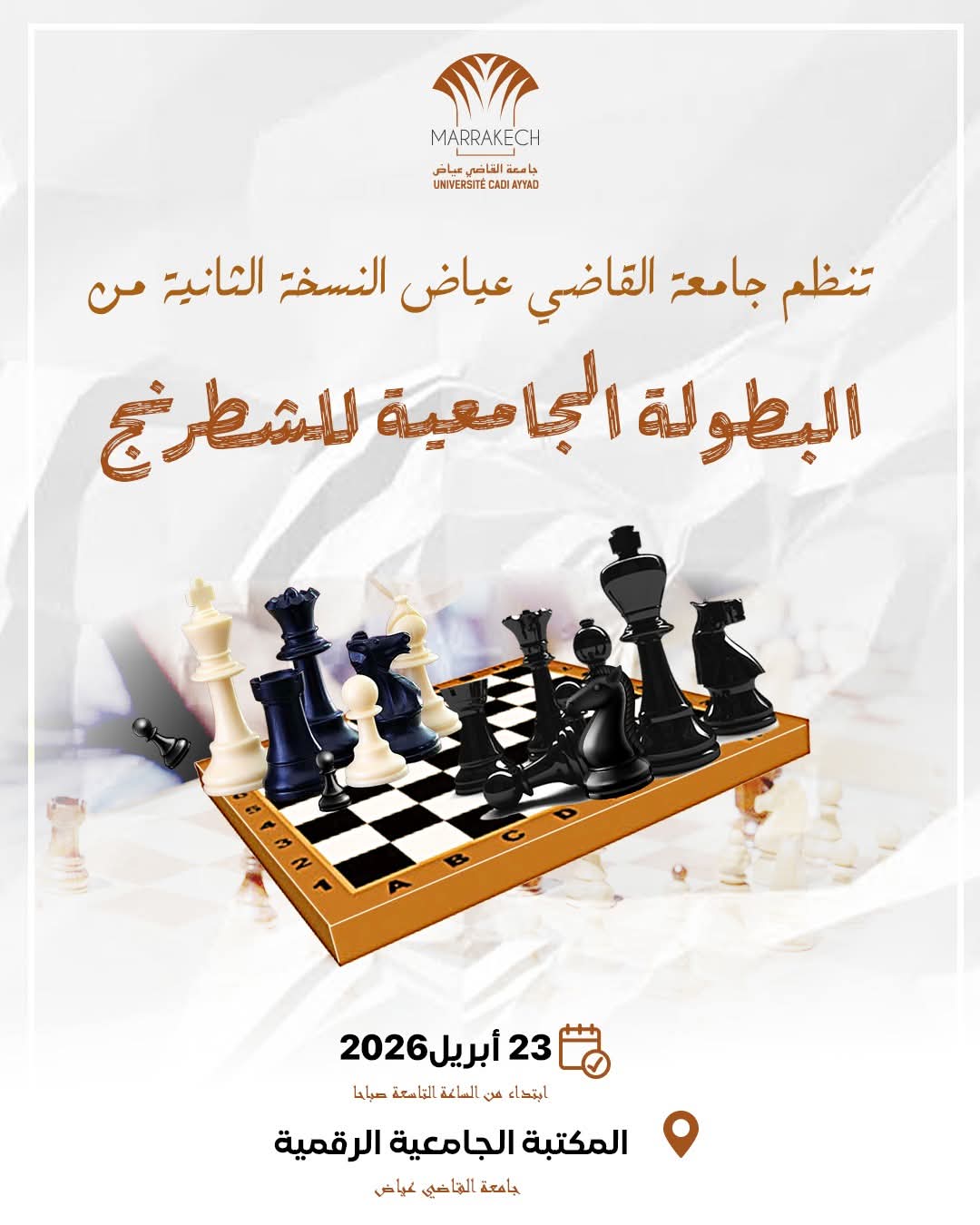 في إطار استراتيجيتها الرامية إلى تعزيز الحياة الجامعية وتشجيع الأنشطة الثقافية والفنية والرياضية، تعتزم جامعة القاضي عياض بمراكش تنظيم النسخة الثانية من البطولة الجامعية للشطرنج، وذلك يوم الخميس 23 أبريل 2026 بالمكتبة الجامعية الرقمية، ابتداء من الساعة العاشرة صباحا، لفائدة الطلبة المنتمين إلى مختلف المؤسسات التابعة للجامعة.