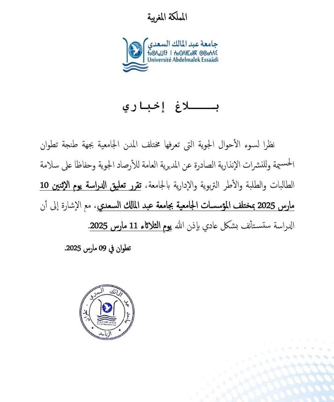 نظرا لسوء الأحوال الجوية التي تعرفها مختلف المدن الجامعية بجهة طنجة تطوان الحسيمة وللنشرات الإنذارية الصادرة عن المديرية العامة للأرصاد الجوية وحفاظا على سلامة الطالبات والطلبة والأطر التربوية والإدارية بالجامعة، تقرر تعليق الدراسة يوم الإثنين 10 مارس 2025 بمختلف المؤسسات الجامعية بجامعة عبد المالك السعدي، مع الإشارة إلى أن الدراسة ستستأنف بشكل عادي بإذن الله يوم الثلاثاء 10 مارس 2025.