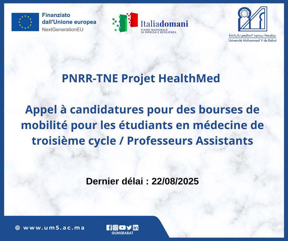 Dans le cadre du programme du PNRR-TNE (D.D. 67/2023) de mobilité internationale HealthMed : Innovation in Medical Education Digital transition sustainable development and health Environment, un appel à candidatures pour des bourses de mobilité a été lancé.