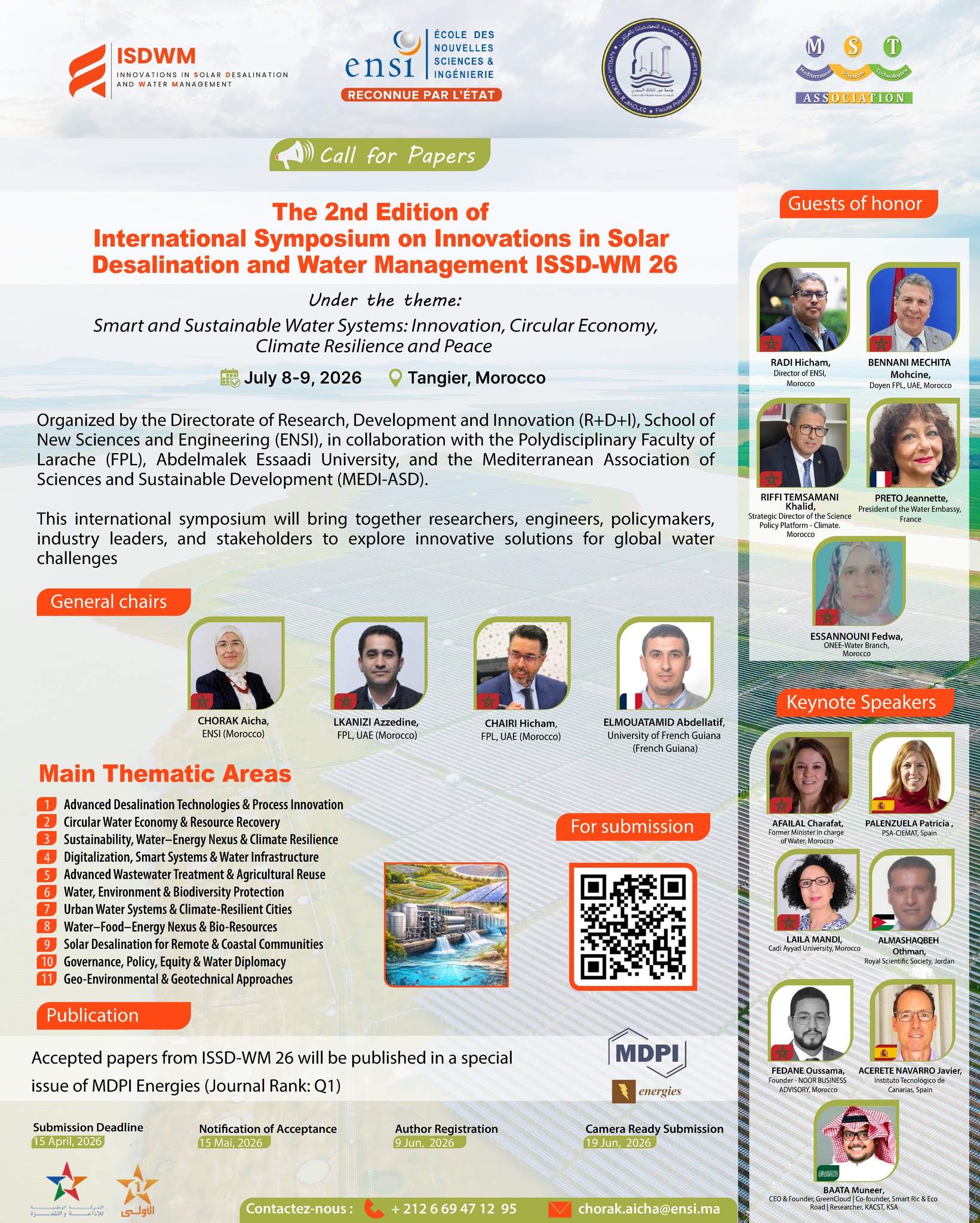 La Division Recherche, Développement et Innovation (R+D+I) de l’Ecole des Nouvelles Sciences et Ingénierie (ENSI) de Tanger, en compagnie de la Faculté Polydisciplinaire de Larache – Université Abdelmalek Essaâdi et MEDI-ASDD, a le plaisir d’annoncer le 2ème Symposium International sur les Innovations en Dessalement Solaire et Gestion de l’Eau (ISSD-WM 2026) 📅 8-9 juillet 2026