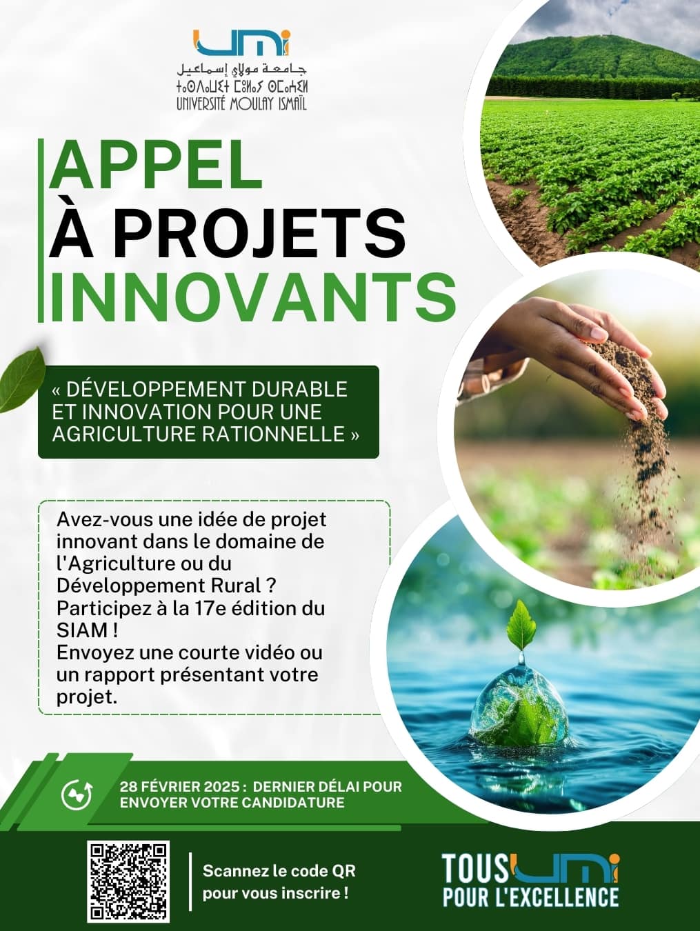 Dans le cadre de la 17ᵉ édition du Salon International de l’Agriculture au Maroc (SIAM), qui met en lumière les défis et opportunités liés à l’agriculture durable, l’Université Moulay Ismaïl a le plaisir de lancer un appel à projets sous le thème : « Développement rural et innovation pour une agriculture rationnelle ».