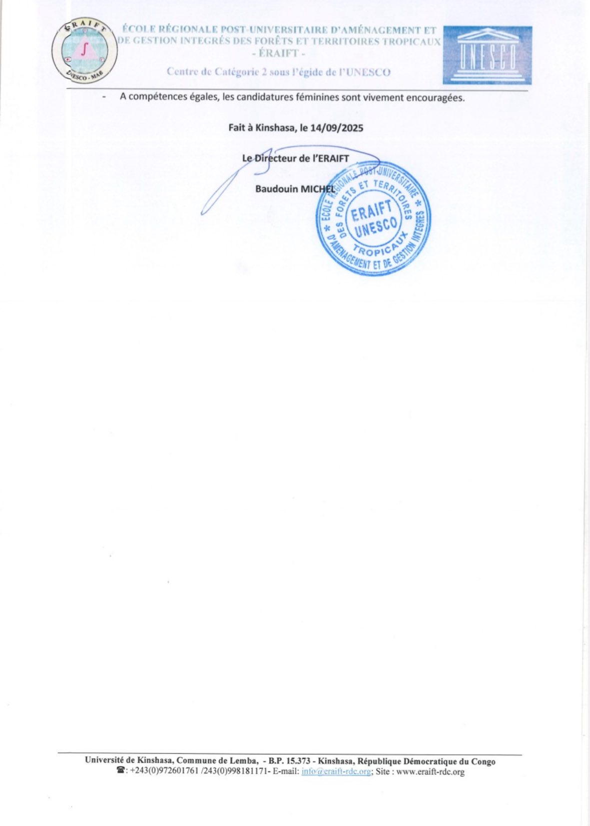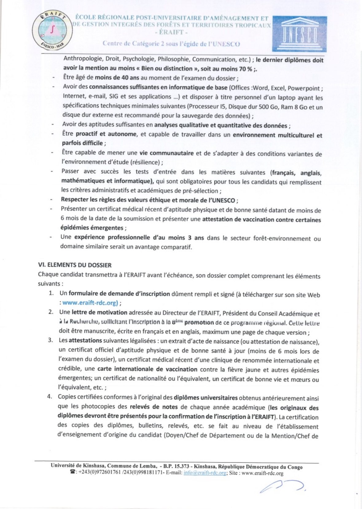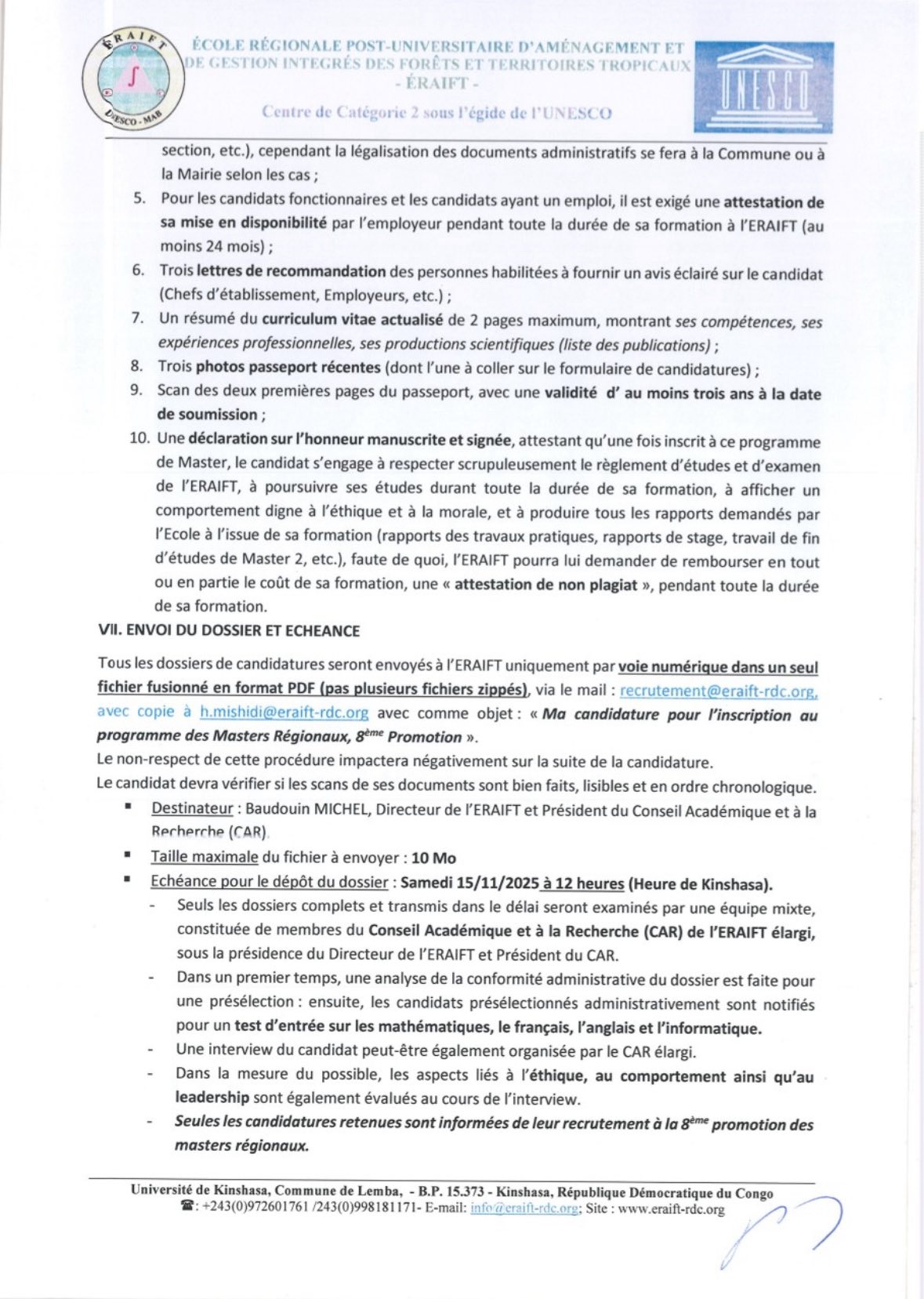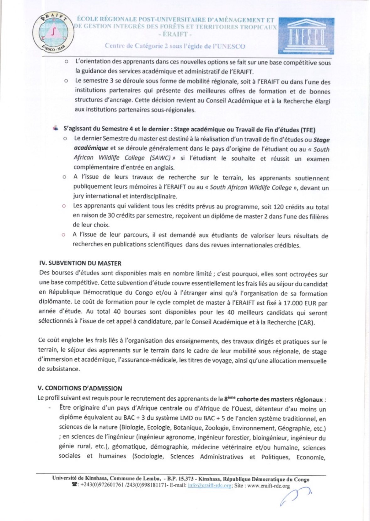 Appel international à candidatures pour le recrutement des 40 boursiers de la 8ème promotion des masters régionaux diplômants, ERAIFT