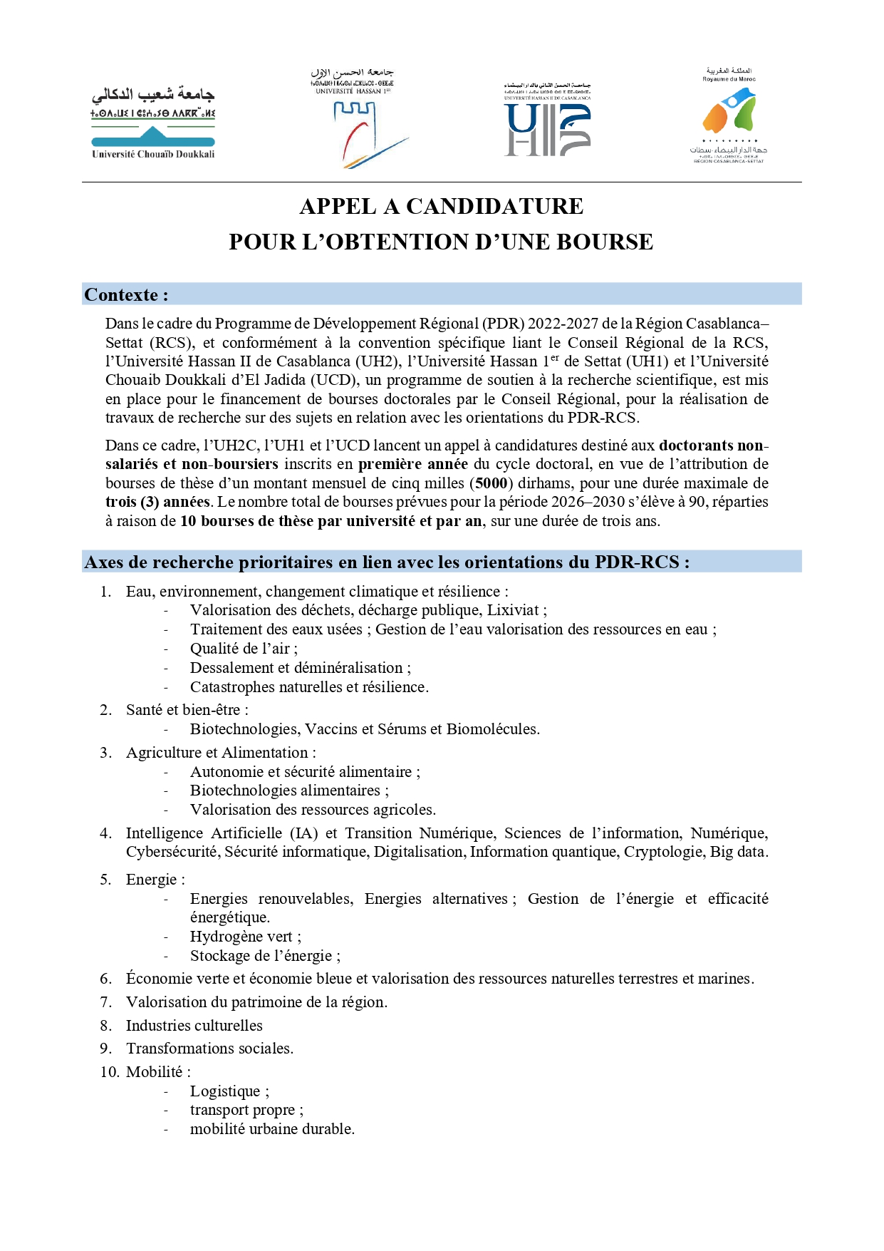 Dans le cadre du Programme de Développement Régional (PDR) 2022-2027 de la Région Casablanca–Settat (RCS), et conformément à la convention spécifique liant le Conseil Régional de la RCS, l’Université Hassan II de Casablanca (UH2), l’Université Hassan 1er de Settat (UH1) et l’Université Chouaib Doukkali d’El Jadida (UCD), un programme de soutien à la recherche scientifique, est mis en place pour le financement de bourses doctorales par le Conseil Régional, pour la réalisation de travaux de recherche sur des sujets en relation avec les orientations du PDR-RCS.
