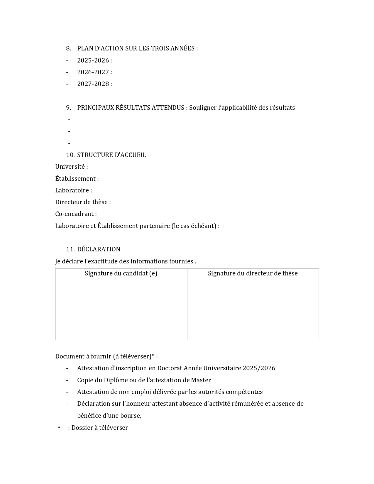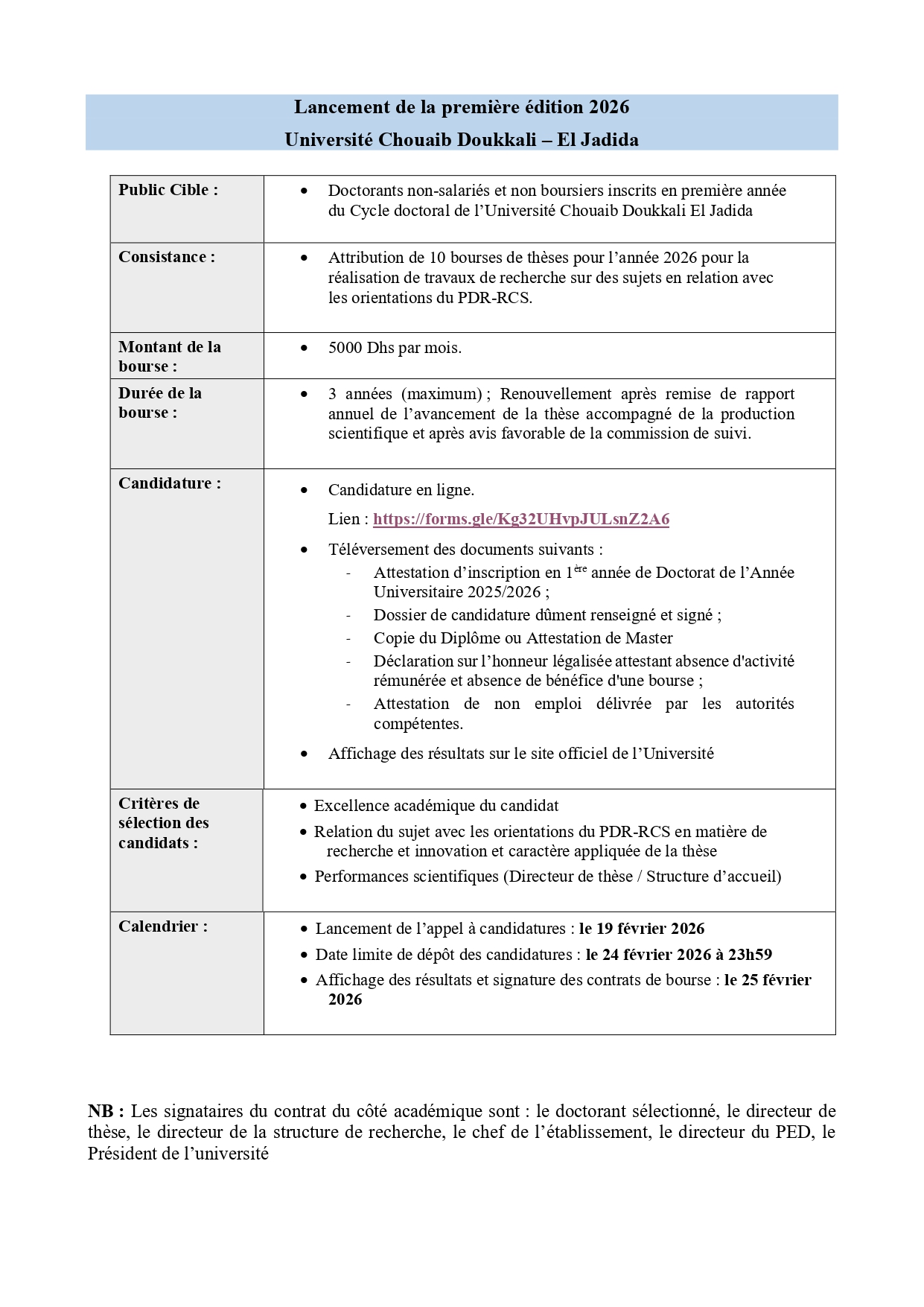 Dans ce cadre, l’UCD, l’UH2C et l’UH1 lancent un appel à candidatures destiné aux doctorants non-salariés et non-boursiers inscrits en première année du cycle doctoral, en vue de l’attribution de bourses de thèse d’un montant mensuel de cinq milles (5000) dirhams, pour une durée maximale de trois (3) années. Le nombre total de bourses prévues pour la période 2026–2030 s’élève à 90, réparties à raison de 10 bourses de thèse par université et par an, sur une durée de trois ans.