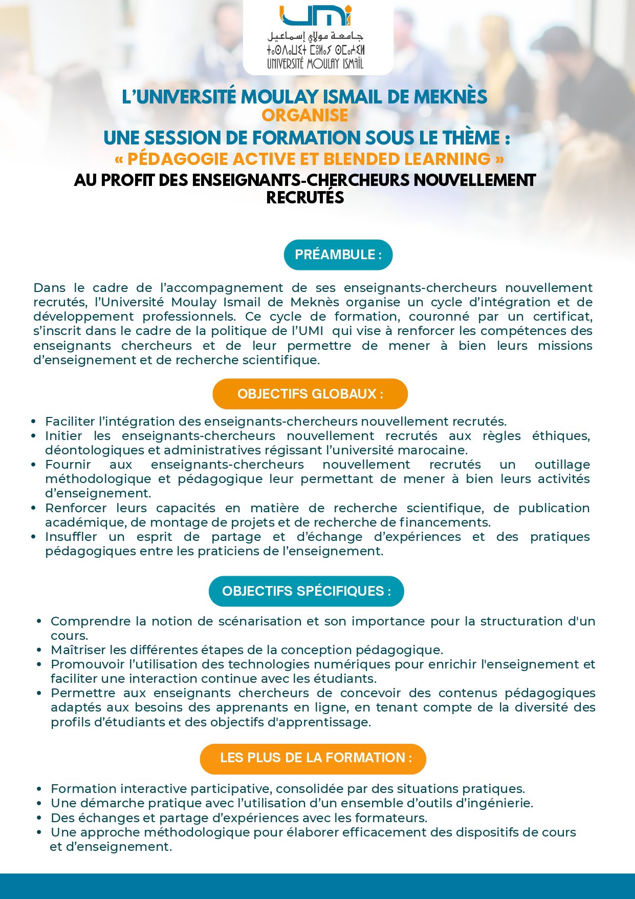 Dans le cadre de sa stratégie d’accompagnement et de renforcement des compétences pédagogiques et scientifiques de son corps professoral, l’Université Moulay Ismaïl organise le lancement d’un cycle de formation certifiant dédié aux enseignants-chercheurs nouvellement recrutés, qui aura lieu le lundi 16 février 2026 à 15h00 à la Salle du Forum de l’ENSAM de Meknès.