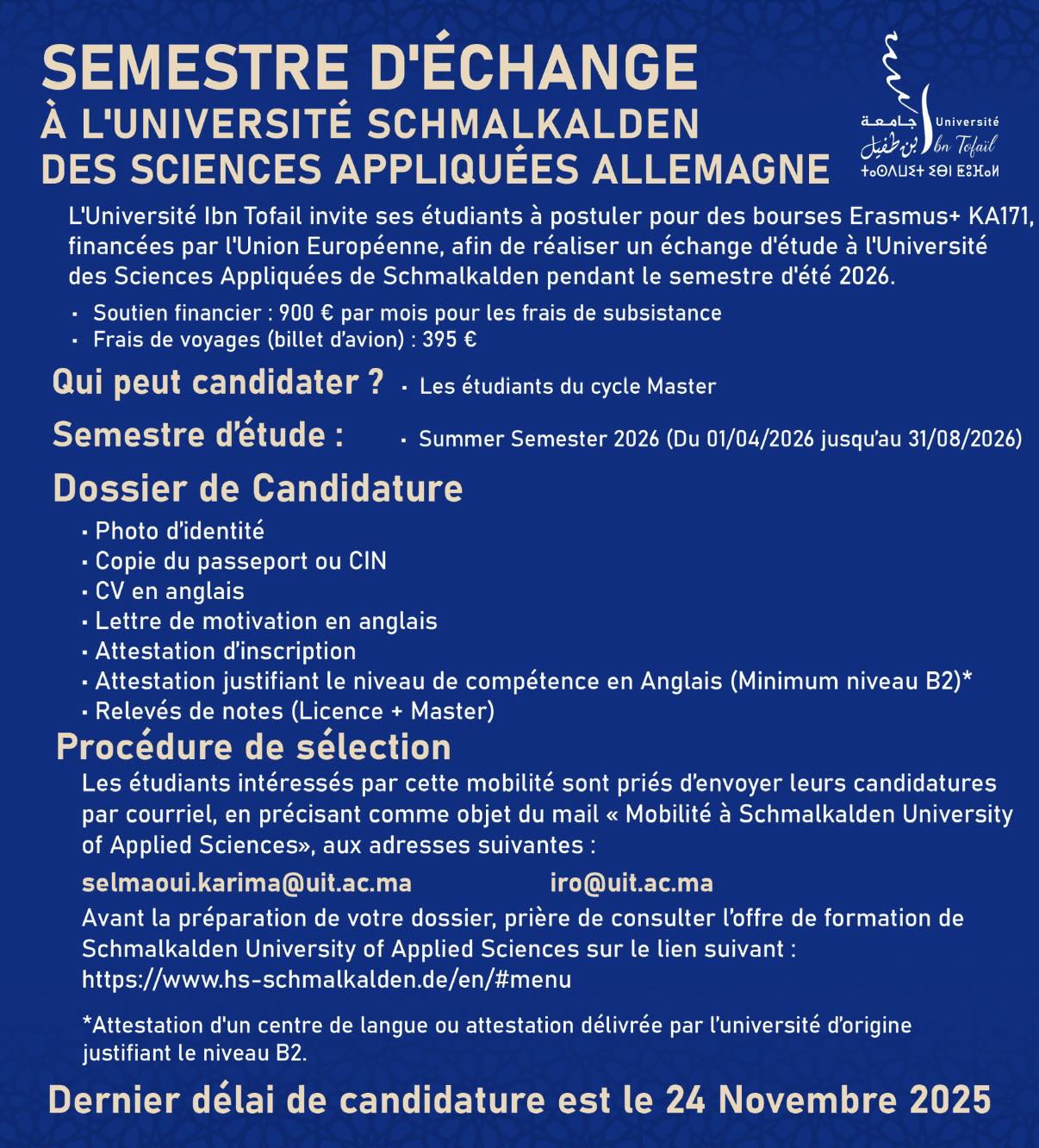 L’Université Ibn Tofail offre une opportunité de mobilité à Schmalkalden University of Applied Sciences pour le semestre d’été 2026 (Avril – Août 2026).